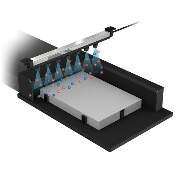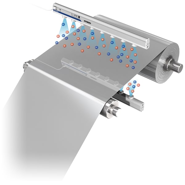 스티커가 부착되는 박리지는 종이 위에 실리콘층을 코팅하기 때문에 매우 큰 대전(50-100 kV)이 발생하여, 이물질 부착·스파크·작업자의 불쾌감 등 다양한 문제가 일어납니다. 제전기를 이용하면 이러한 문제가 해결됩니다.