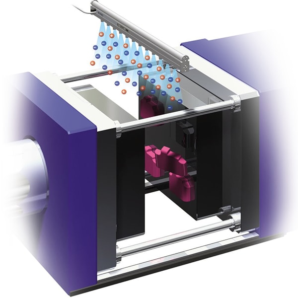 사출 성형 시에는 큰 대전이 발생할 수 있습니다. 정전기로 인해 이물질 불량이 발생하면 폐기해야 합니다. 또한 경우에 따라서는 성형품이 금형에서 빠져나오지 않아 그때마다 작업자가 분리해야 하므로 수율이 악화됩니다. 제전기를 이용하면 이물질 부착 및 성형 잔여물을 방지할 수 있습니다.