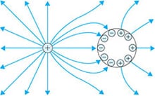 전계(전장)란 대전된 물체의 주변에 존재하며 그 전하에 작용하는 힘이 존재하는 영역이라고 생각할 수 있습니다. 예를 들자면, 어떤 공간에 점 전하*가 존재하게 되면 그 주변 공간이 특별한 성질을 갖게 되는데 거기에 다른 점 전하가 들어오게 되면 그 공간의 성질이 들어온 점 전하에 힘을 가하는, 이를테면 「전하의 세력 범위」라 할 수 있습니다. 그리고 그 세력은 그림과 같이 중심에서 멀어질수록 작아집니다. 이 전계의 강도를 「전계 강도」라고 하며 그림과 같이 중심에서 바깥쪽으로 퍼지고, 멀어질수록 전계 강도가 약해집니다.