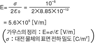 예를 들어 플라스틱 표면을 천으로 마찰했을 때의 대전량은 단위 면적당 10-5[C/m2] 정도이므로 표면에 대전되고 있는 전계는 다음과 같습니다.