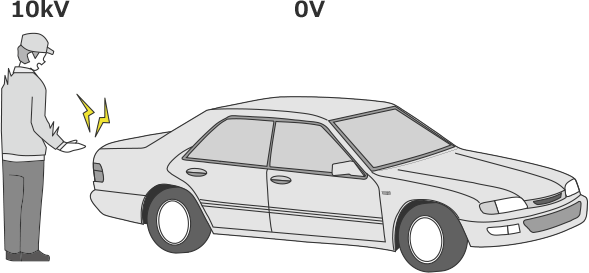 방전 여부는 전압 차이(전위차) 유무와 관련되어 있습니다. 예를 들어 다음 그림과 같이 인체가 10 kV, 자동차가 0 V인 상태에서 자동차 문에 손을 대면 방전이 일어납니다. 둘 사이에 전압 차이(전위차)가 있는 경우에는 전압이 높은 쪽에서 낮은 쪽으로 방전이 일어납니다. 높은 쪽에서 낮은 쪽으로 전기가 흘러 균형을 잡으려 하기 때문입니다.