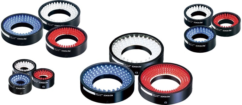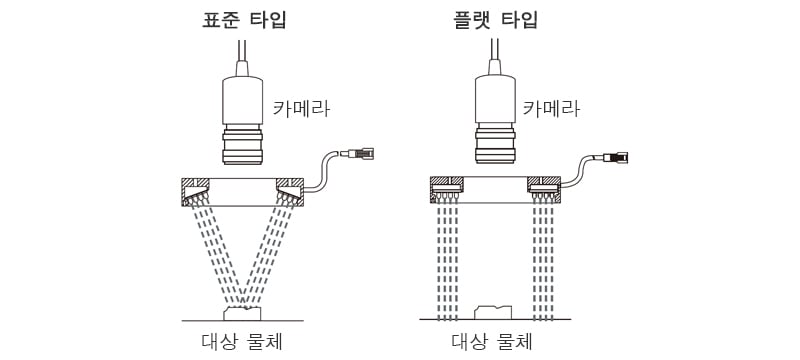 다양한 용도로 활용할 수 있는 다이렉트 링 조명. 뱅크를 연결하여 LED를 배치, 중앙부를 더욱 밝은 광량으로 조사하는 일반 타입과 LED를 수평 배치하여 더욱 균일한 화상을 얻을 수 있는 플랫 타입을 라인업했습니다. 사이즈와 뱅크 유무 등 다양한 라인업 중에서 목적에 맞는 최적의 촬상 조건을 얻을 수 있습니다.
