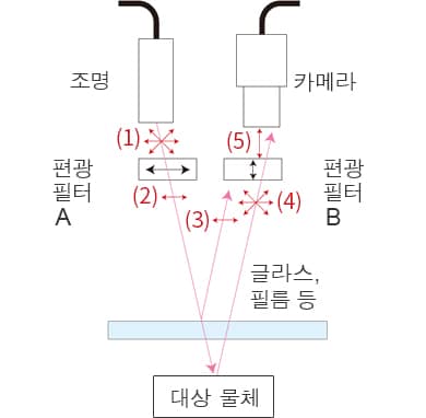 (1)의 빛은 편광 필터A에서 (2) 방향으로 편광된 빛입니다. 필름면(정반사)에서는 그대로 반사되고 (3)의 빛은 편광 필터B에서 차광됩니다. 그러나 대상 물체 표면(확산 반사)에서 반사된 빛은 다시 확산되어 (4)의 빛이 되며, (5)의 편광 성분만 B를 통과하여 카메라에 입광됩니다.