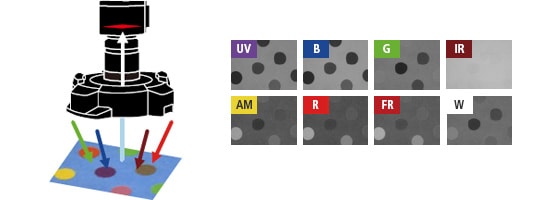 파장을 바꾸면서 촬상한 8장의 그레이 화상을 기본으로 화소별 색을 분석하여 컬러 검사를 합니다.