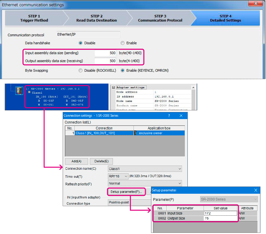 - *SR-X/SR 시리즈의 입력 어셈블리 데이터 크기(송신)와 출력 어셈블리 데이터 크기(수신)가 각각 KV 시리즈의 입력 크기와 출력 크기보다 클 때 통신이 가능합니다.