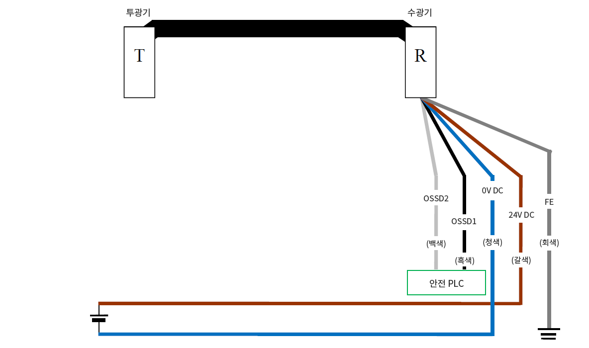 - 안전 PLC의 0 V를 GL-R의 0 V와 연결해 주십시오.